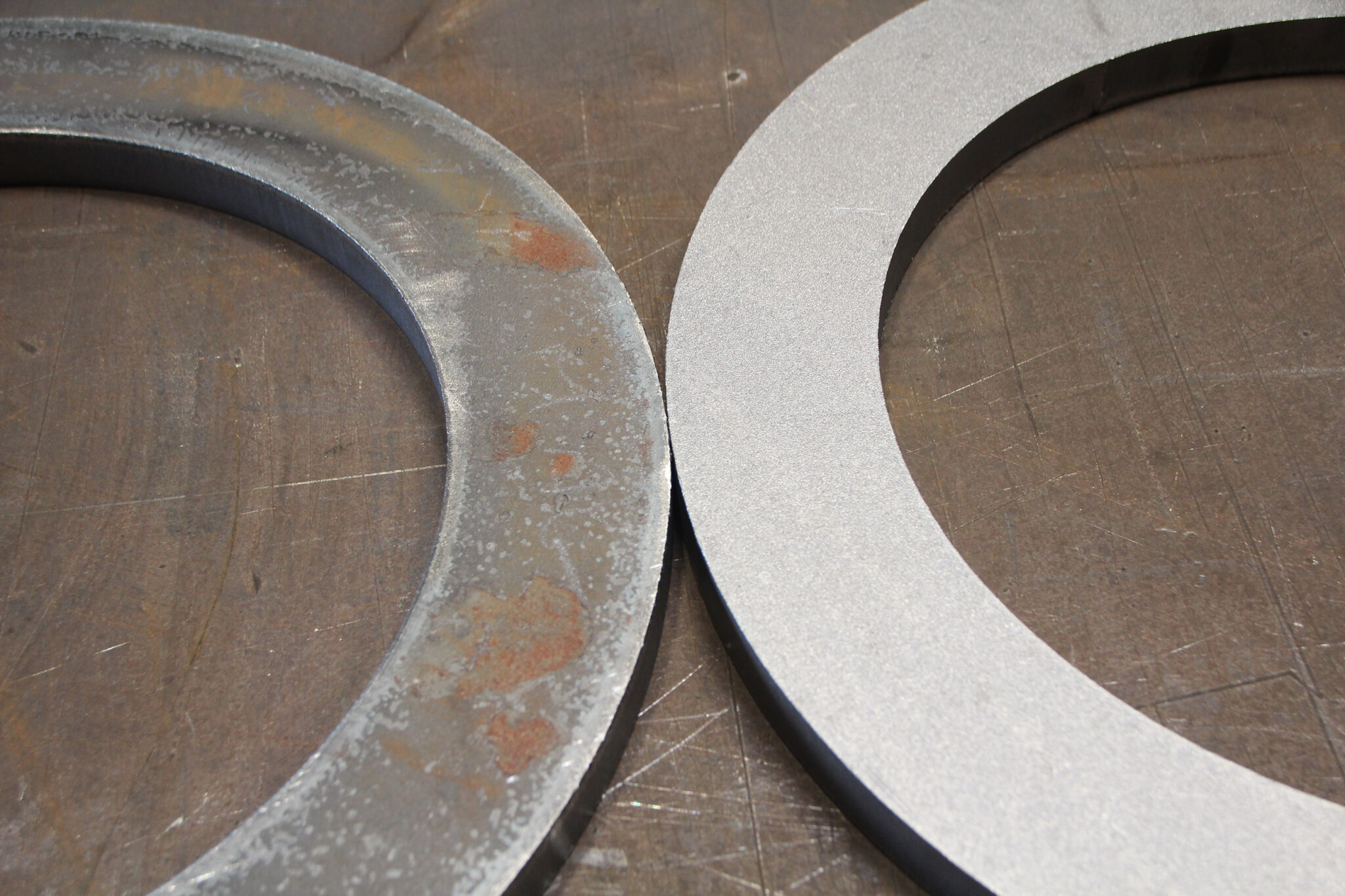 Le grenaillage est un procédé de traitement de surface de l’acier par projection de grenaille (petites billes d’aciers) à haute vitesse sur la surface de la pièce. Les impacts permettent d’enlever la calamine, la rouille, le scorie lié à la découpe, afin d’obtenir une surface totalement propre et décapée visuellement et techniquement.